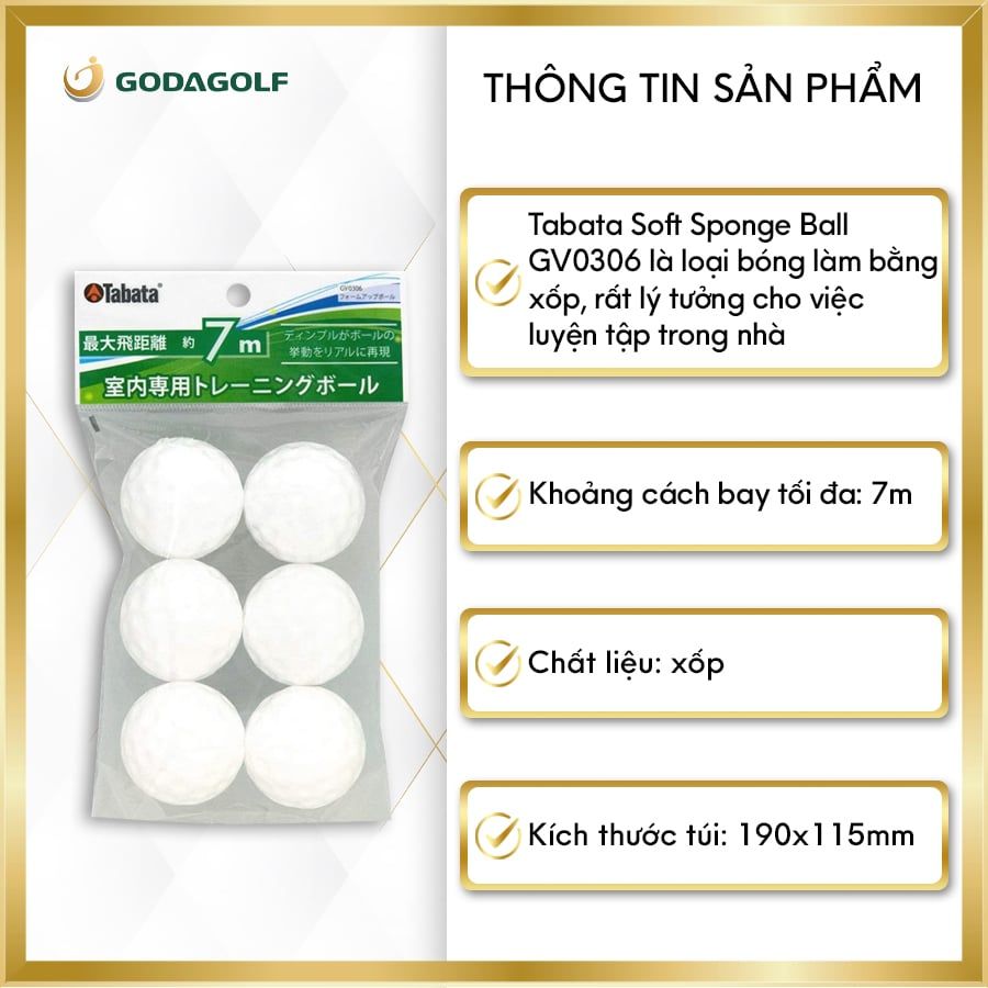 Gói 6 bóng xốp tập golf Tabata là sự lựa chọn hoàn hảo cho những ai muốn duy trì thói quen luyện tập golf ngay tại nhà một cách an toàn và hiệu quả. Với thiết kế nhẹ, độ bền cao và khả năng hạn chế khoảng cách bay, sản phẩm này không chỉ giúp người chơi cải thiện kỹ năng mà còn mang lại trải nghiệm tập luyện thú vị, thư giãn mọi lúc mọi nơi.